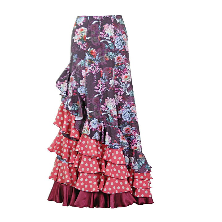 花柄×水玉×サテンの豪華生地使い! 斜め切り替えで左右の表情が違うデザインスカート。