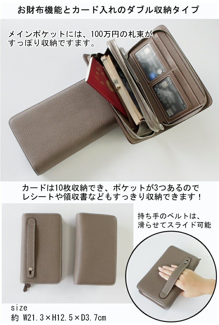 本革 ダブルファスナー セカンドバッグ ウォレット パスポートやチケット、名刺やカード類が収納できるスペースと紙幣、領収書などが収納できる財布がひとつになったセカンドバッグ。